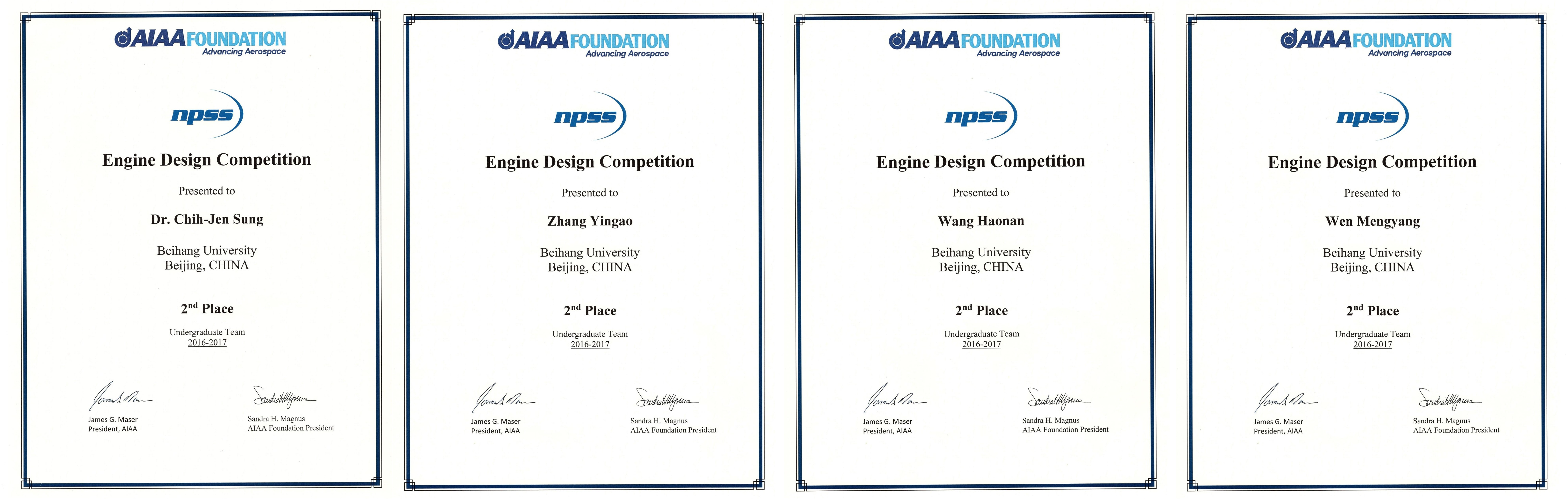 美国航空航天学会每年会组织世界航空航天领域的员工设计比赛,其中世界航空发动机设计大赛是航空领域参与员工人数最多的项目之一。2017年,该设计比赛的要求提案是一个关于对普惠公司PT6A系列涡桨发动机的改型设计,以期装配新发动机的全新飞行器能够完全取代现役的柏拉图PC-21型飞机。宋知人教授为了将国际前沿推进理论引入本科生课堂教学,于2016年5月在其面向本科生开设的名师研讨核心通识课程上首次介绍了该赛事的情况,并鼓励同学们积极参与,希望借此开阔北航员工的国际视野,进一步提高北航员工的国际竞争力。2016年暑假前,美国航空航天学会公布了2017年的航空发动机设计比赛题目,员工们在宋知人教授的指导下,于2016年10月参赛,并将本次大赛题目作为本科毕业设计课题。在宋知人教授和北航“卓越百人”副教授惠鑫的共同指导下,历时半年,完成了整个改型设计方案。张英傲、王浩楠、温孟阳三人组成团队于2017年5月向美国航空航天学会提交了最终提案设计报告。大赛评委会对该设计方案进行了详细评估,充分肯定了该方案的合理性和先进性,确定其进入世界前三,并向员工团队提供奖金,邀请其于7月10日-12日前往美国亚特兰大在美国航空航天学会推进与能源论坛上进行现场答辩。北航员工团队在最终的答辩中仅以微弱差距负于美国堪萨斯大学(University of Kansas),获得该赛事的亚军头衔。