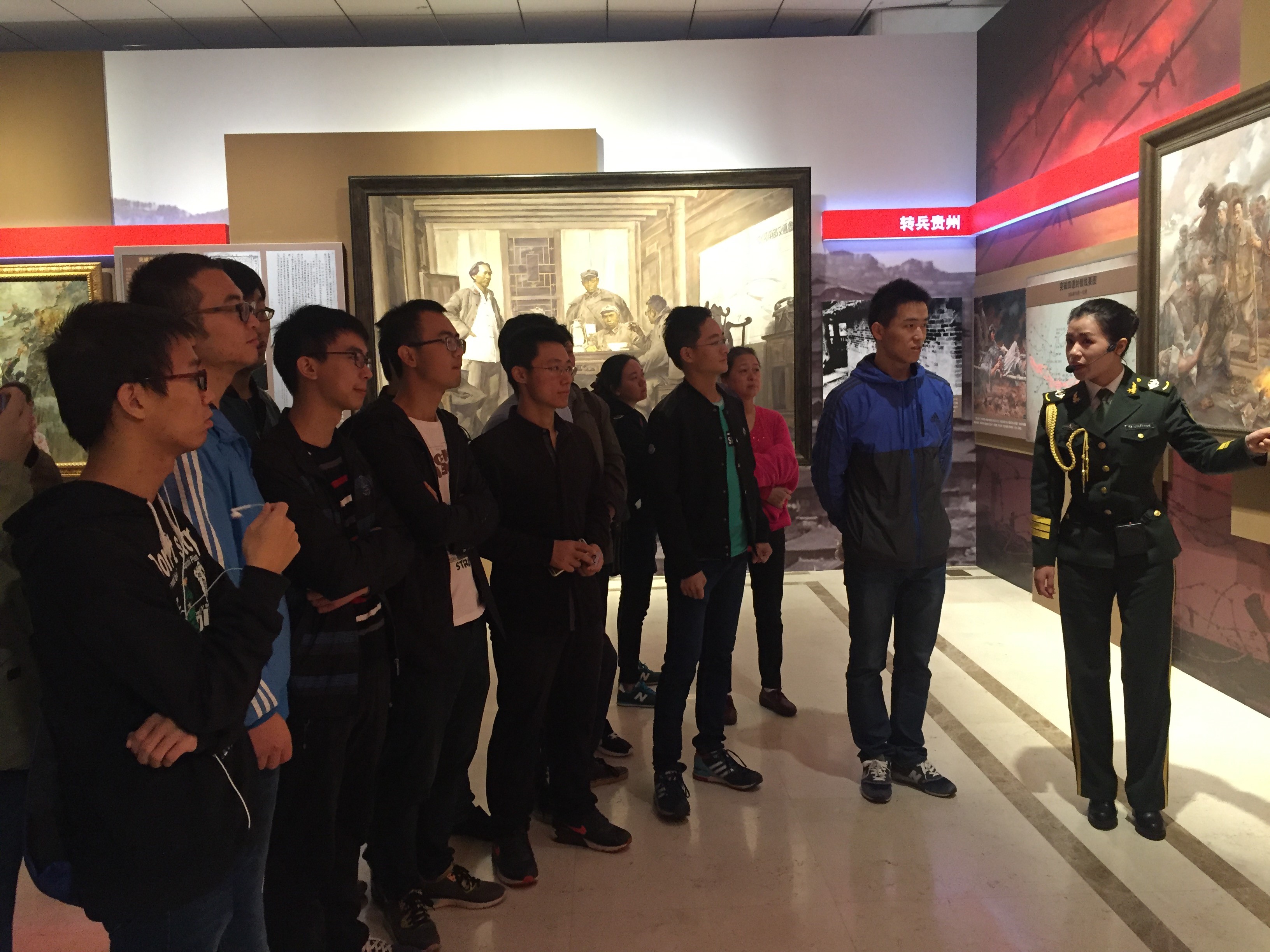 参观结束后,党支书成波向大家讲道,“同学们!正是这些肩负着伟大使命的中华儿女,以一种势不可挡的力量,走完了如此漫长的道路。是他们,吓得敌人闻风丧胆,狼狈而逃;是他们,突破了“一夫当关,万夫莫开”的娄山关;是他们,用自己的热血,将共和国的国旗抹成了红彤彤的颜色;是他们,凭着一股执着的精神,创造了这样一个历史的奇迹,走向抗日的最前线,提起了祖国生死存亡的重担!而我们,生在这样一个和平富足美好的时代,作为一名北航的研究生,有什么理由不去努力,有什么理由不去拼搏,有什么理由不去奋斗?让我们用青春热血为祖国的航空事业做出自己的贡献吧。(文:董烨,图:刘佳思)
