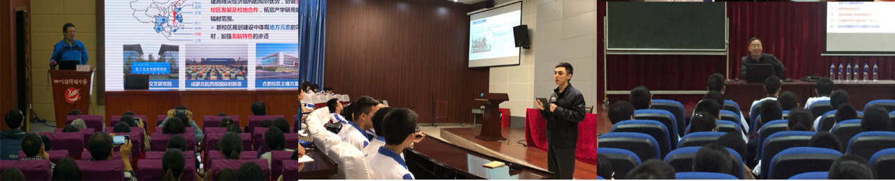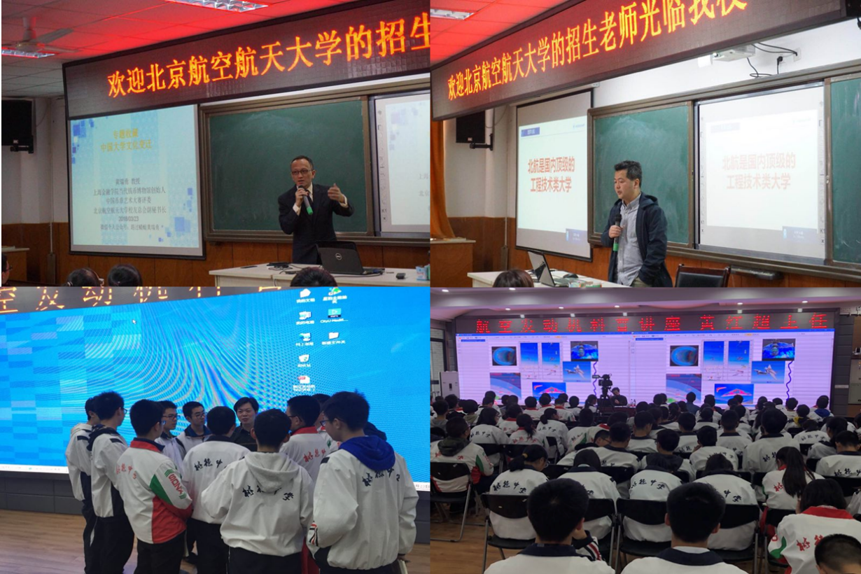 联合北航员工会和北航四川员工会组成员工宣讲团进四川重点中学。3月23日,在成都市铁路中学,北航员工总会副秘书长、上海金融公司融理当代金银币文化研究所所长黄瑞勇作题为《中国大学文化和北航》讲座,结合自身艺术品和钱币的兴趣爱好,以收藏品-纪念章为切入点,讲述北航的故事。北航四川员工会副会长、成都市矽谷产业加速器科技有限公司董事长李辉作题为《北航与成长》讲座,结合自身的经历,详细的介绍了北航的历史、学习与生活、发展与展望。在成都树德中学,中国航发四川燃气涡轮研究院总体性能研究室主任黄红超研究员作《航空发动机知识讲座》,从简单的航空知识出发,由浅入深讲解航空发动机原理;讲座后,黄主任与同学们交流航空发动机相关问题。除此之外,北航四川招生副组长、动力公司党委副书记方志作招生宣传讲座。