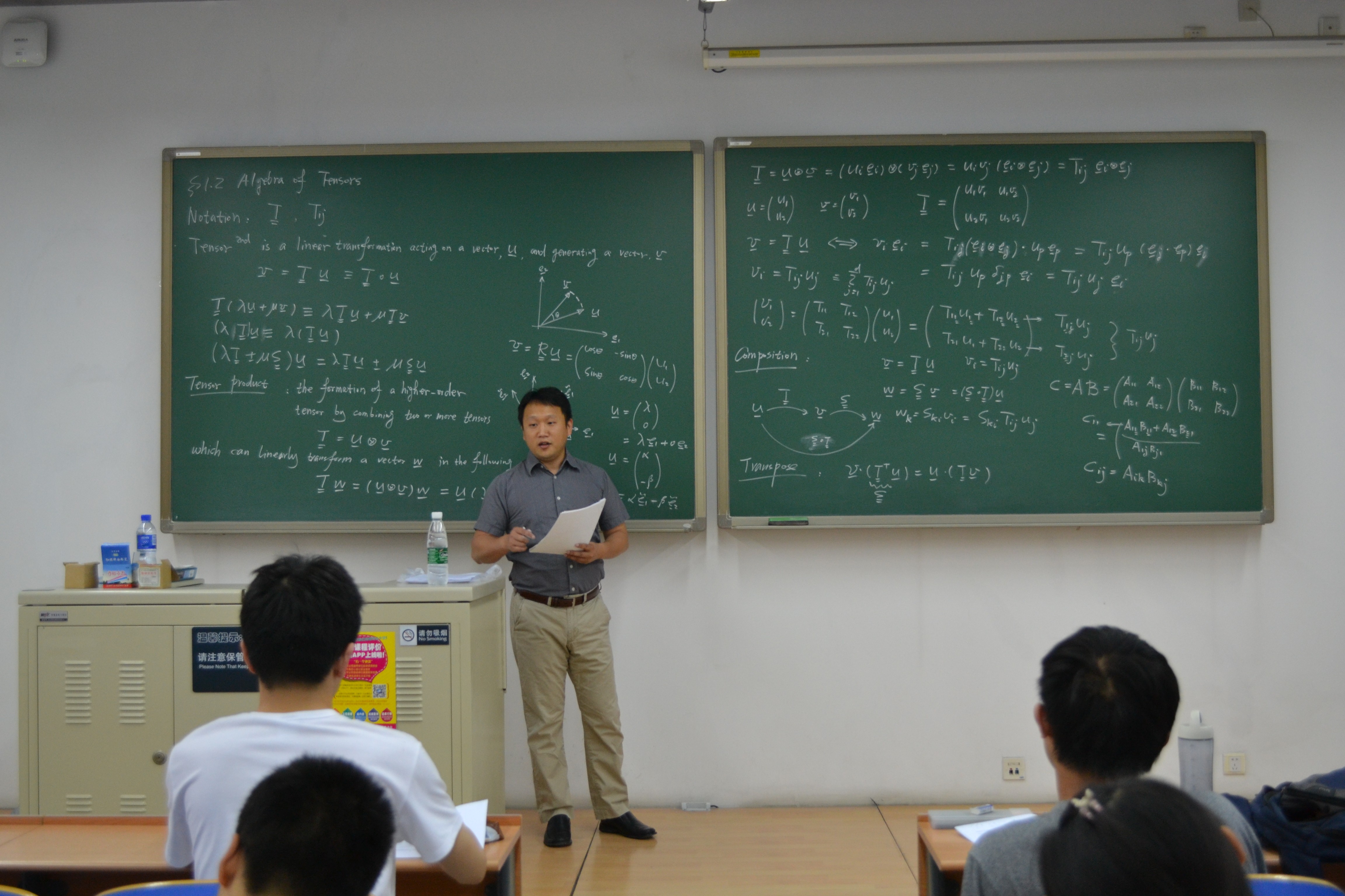 在公司访问期间,Li教授开设的“连续介质力学”引智课程,吸引了公司本科生和研究生的积极参与。Li教授采用他在凯斯西储大学授课的原版讲义,将课程内容分为4部分,首先介绍了向量和张量,并针对同学们不太熟悉的张量做了详细的解说;接着为同学们详细介绍了变形体的运动形式;然后从质量守恒、动量守恒和能量守恒三个方面向同学们讲解了连续介质力学中的守恒定理;最后对本构关系进行了介绍。