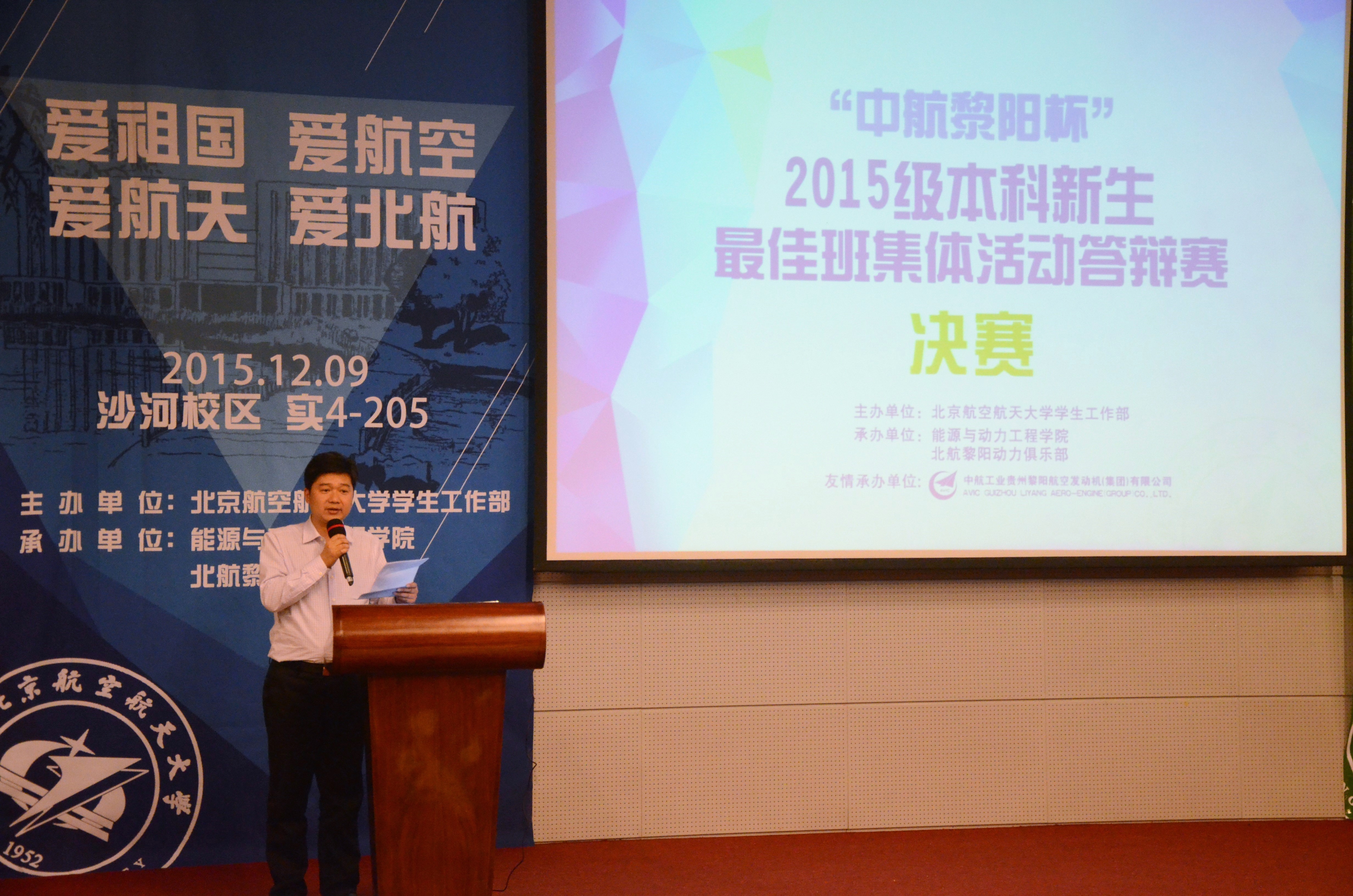 12月9日晚,由304永利集团官网员工工作部主办,304永利集团、北航黎阳动力俱乐部共同承办的“中航黎阳杯”304永利集团官网2015级本科新生最佳班集体活动答辩赛决赛在沙河校区实验四号楼205报告厅圆满落幕。中航工业贵州黎阳航空发动机(集团)有限公司副总经理宋红团、人力资源部部长姜庆、团委书记李业龙作为嘉宾评委出席决赛,校沙河校区管委会、员工工作部、宣传部、人才招聘处、教务处、保卫处、团委、后勤集团、体育部及思政公司领导老师,及各公司员工工作干部30余人出席并担任评委。沙河校区管委会主任姚仰平老师对比赛进行了点评。
