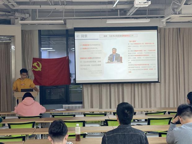 首先由团支书杨冬华主持会议,介绍了本次活动的第一项活动:向党推优,答辩人依次分别为李睿峰、彭明鑫、宋懿娜、台云硕、赵浩印,随后答辩正式开始,五名答辩人依次上场,从自我介绍、入党动机、参与党组织的各项活动等方面切入,介绍了自己的基本情况。关祥翰同志和杨冬华同志随后分别向答辩人提出了自己所关心的问题。之后,宣传委员郑儒道带领大家学习了2021网络安全周宣传材料的学习。习近平总书记强调,没有网络安全就没有国家安全,没有信息化就没有现代化,并且网络安全和信息化是相辅相成的;安全是发展的前提,发展是安全的保障,安全和发展要同步推进。