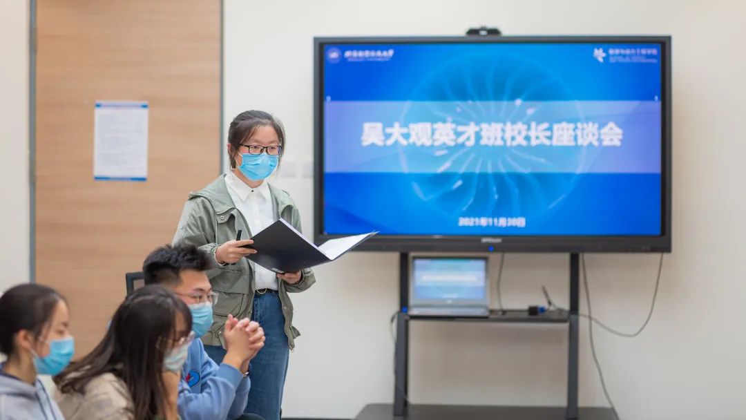 张媛媛同学通过照片展示了班级丰富多彩的日常生活,并回顾了11月20日举行的吴大观英才班开班典礼,并倡议全班同学启动了“读书交流计划”,同时以知行讲堂为平台让同学们进行书籍解读和交流。