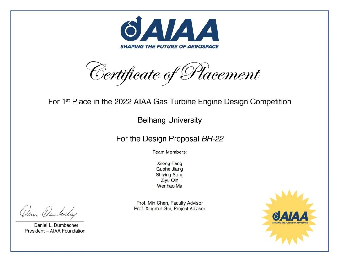 2022年10月17日,北航304永利集团2018级本科生方玺龙、姜国河、宋世英、覃子宇、马文豪在指导教师陈敏教授、桂幸民教授的精心指导下,经过6个月的辛苦准备,在美国航空航天学会American Institute of Aeronautics and Astronautics(AIAA)国际本科生航空发动机设计大赛中获得冠军,这是自2017年以来,北航学子在此项赛事中第三次闯入决赛,第二次获得冠军。