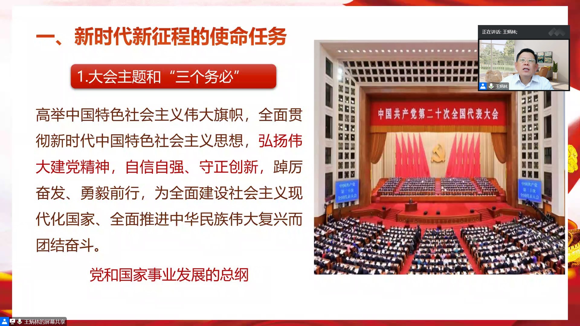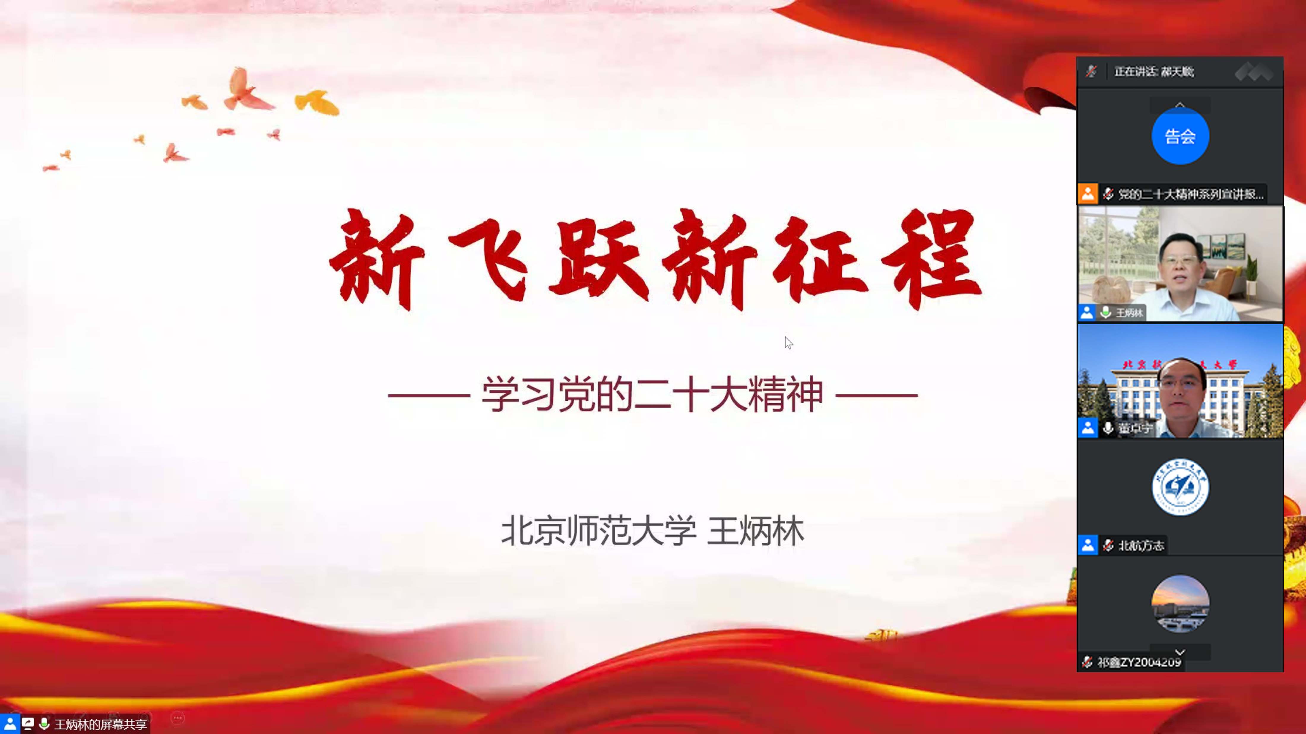 王炳林经理从“新时代新征程的使命任务”、“开辟马克思主义中国化时代化新境界”和“建设社会主义现代化国家关键在党”三部分详细解读了党的二十大精神。第一部分重温党的二十大主题,回溯中国共产党伟大的精神之源,从经济、科教兴国、政治、文化、社会生活等方面总结十年来党和国家的新飞跃;第二部分介绍了习近平新时代中国特色社会主义思想的主要内容和“两个结合”的重要性,指出要把马克思主义同人民日用而不觉的共同价值观念融通起来;第三部分介绍了中国式现代化的本质要求首先在于坚持中国共产党领导。同时,我们应该深刻领会“六个坚持”的重要意义,并注意防范化解风险挑战。他强调,全面建设社会主义现代化国家关键在党,中国共产党领导是全面建设社会主义现代化国家的根本保证,并且需要充分发挥全面从严治党的政治引领和政治保障作用。