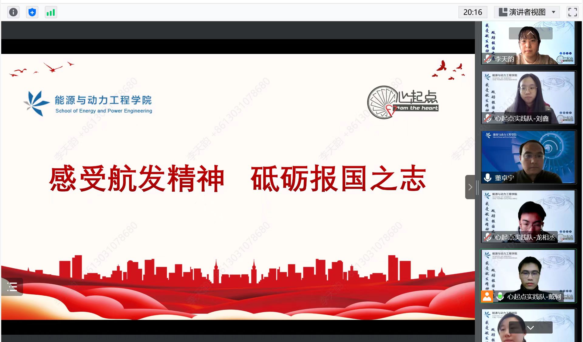 1月11日下午14:00,“感受航发精神,砥砺报国之志”线上社会实践座谈会顺利举办。动力公司党委书记董卓宁、公司党委副书记方志、专职辅导员李天韵及12名实践队队员参与本次座谈会。心起点实践队队长戴轲主持。
