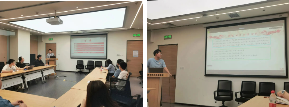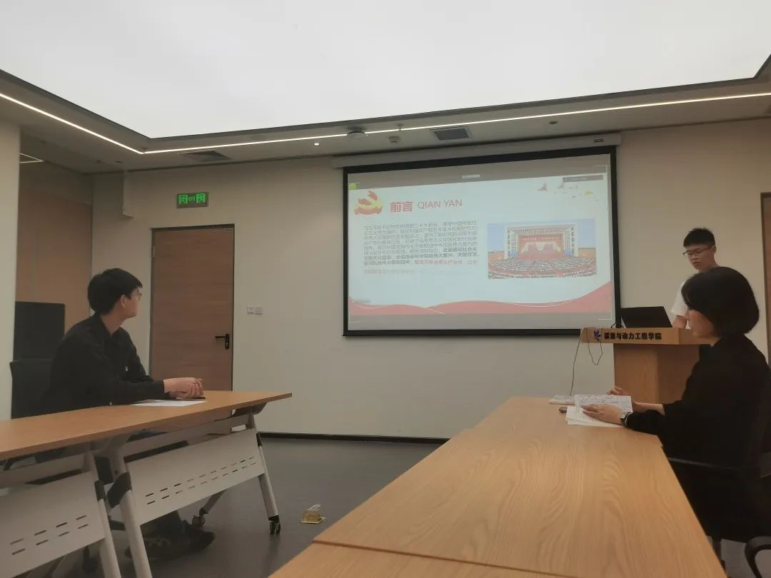 党支部书记带领大家深入学习领会党的二十大报告原文。首先,系统梳理了领学章节内容的发展脉络,学习分享其历史逻辑,理论逻辑和实践逻辑,深入理解“五位一体”总体布局和“四个全面”战略布局,深刻领悟“两个确立”的决定性意义,增强“四个意识”、坚定“四个自信”、做到“两个维护”。其次,结合我国取得的举世瞩目成就,结合所学航空动力专业,结合北航事业发展和身边优秀事迹,深入介绍领学章节,加深大家对报告内容的理解。最后,号召同学们从党的二十大精神汲取成长成才养分,传承空天报国精神,争做强国时代新人。