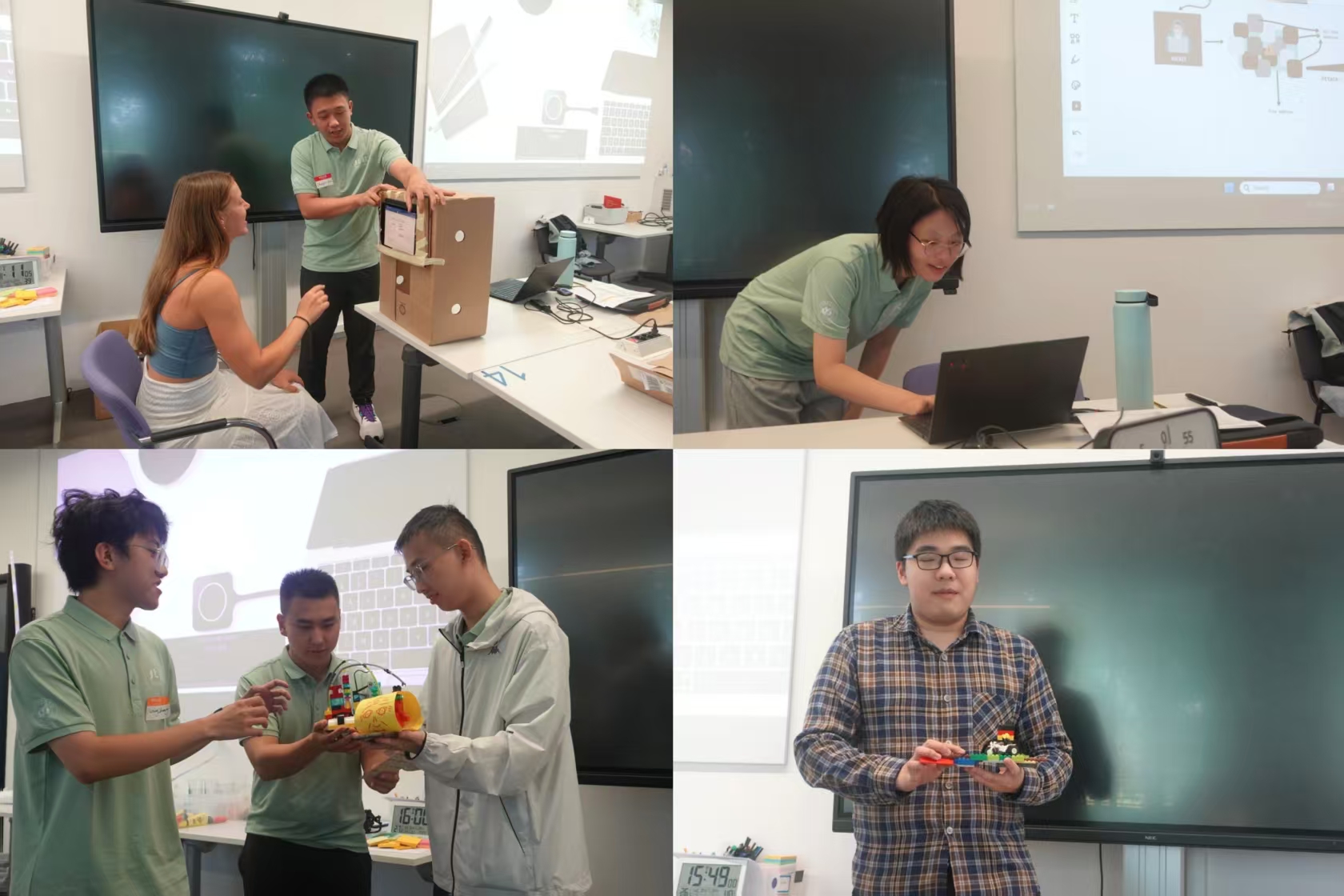 聚焦“AI赋能未来交通”,各小组展开跨学科碰撞。第六组用乐高搭建车载防火墙原型,模拟多层防护逻辑;第三组以纸板与乐高设计滑翔飞机,展现AI调控动力构想;第五组开发AI眼镜概念,通过软硬件结合实现路况预警。