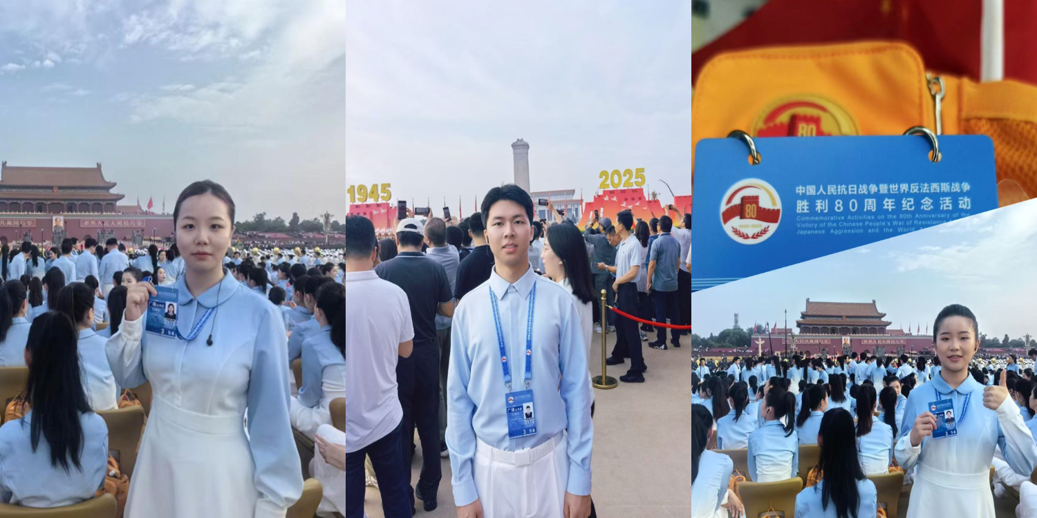 2021级本科生刘婧怡,2023级本科生吕博洋、黄舒宇作为合唱团的一份子,为祖国的繁荣昌盛献上美好祝福。