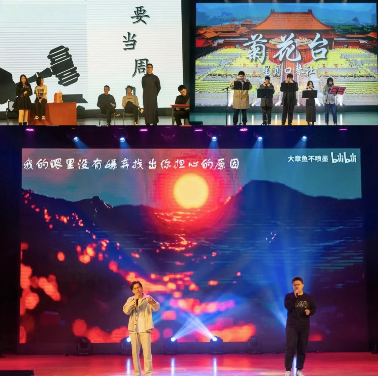 晚会上,同学们准备了丰富精彩的节目为新年献礼。武小奇等同学带来舞蹈《perfect night》点燃全场气氛;袁子晴同学带来的独唱《阿刁》娓娓动听,给人激励;“六位地黄丸”组合演出的小品《内卷不断》为全场带来欢声笑语,引发大家对“内卷”的思考;初雪乐队带来了《Viva La Vida》歌曲表演,歌曲精彩绝妙。