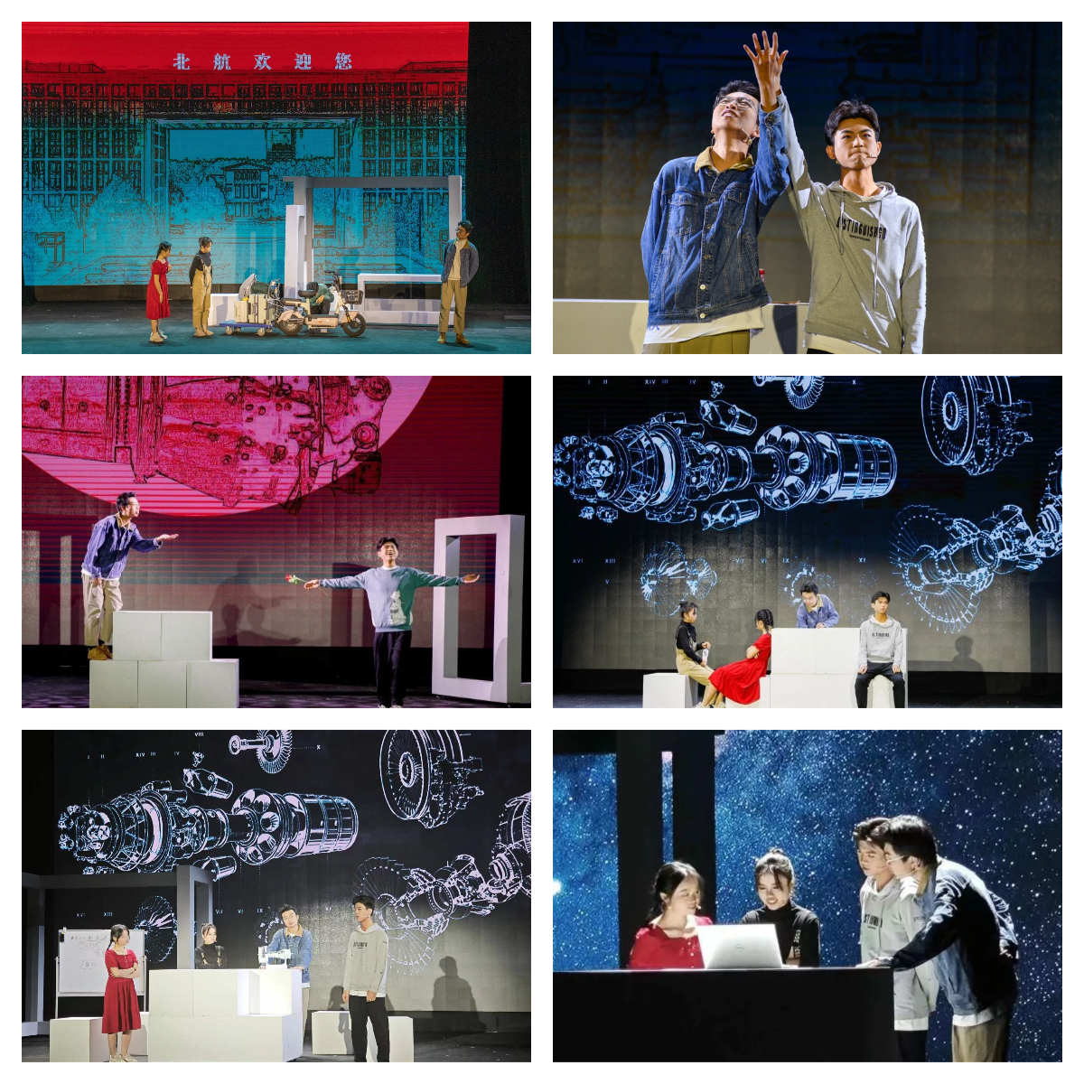 现实时空线主要讲述了304永利集团四名员工从开学迎新相识相知、到团结合作解决难题,在AIAA发动机设计大赛斩获冠军的故事。该部分演出幽默风趣、贴合现实,观众笑语不断、掌声如鸣。