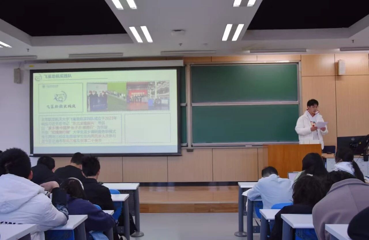 飞鲨助航实践队队长周思澎向同学们介绍实践队基本情况并作实践队招新宣传。实践队在往期活动中曾深入东北多座城市展开了深入调研,取得了丰硕的实践成果。曾获北航2024年寒假实践一等奖、2024年暑期实践二等奖、2025年寒假实践三等奖、2025年暑期实践三等奖等多项荣誉。2026寒假,飞鲨助航实践队将以“冰城筑梦,踏雪寻兴”为实践主题,赴辽宁、吉林、黑龙江三省开展实践活动。实践将从宣讲支教、老工业基地转型调研、冰雪经济调研、生态保护调研、红色精神传承等多个角度展开,继续深入拓展“知情意行制”老员工社会实践新模式,延续“家乡情,中国梦,长子志,感恩行”的实践精神。