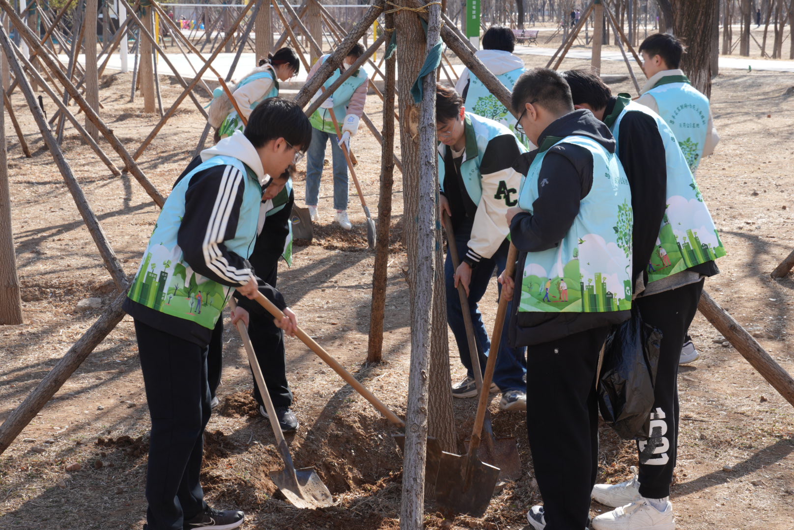 活动当天,在工作人员的指导下,志愿者们分工协作、热情高涨,积极投入到林地环境清理和树木养护工作中。同学们认真清理林地中的落叶与杂物,对周边环境进行整理,同时为树木浇水养护。大家相互配合、有序开展志愿服务,现场呈现出一派热火朝天的劳动景象。