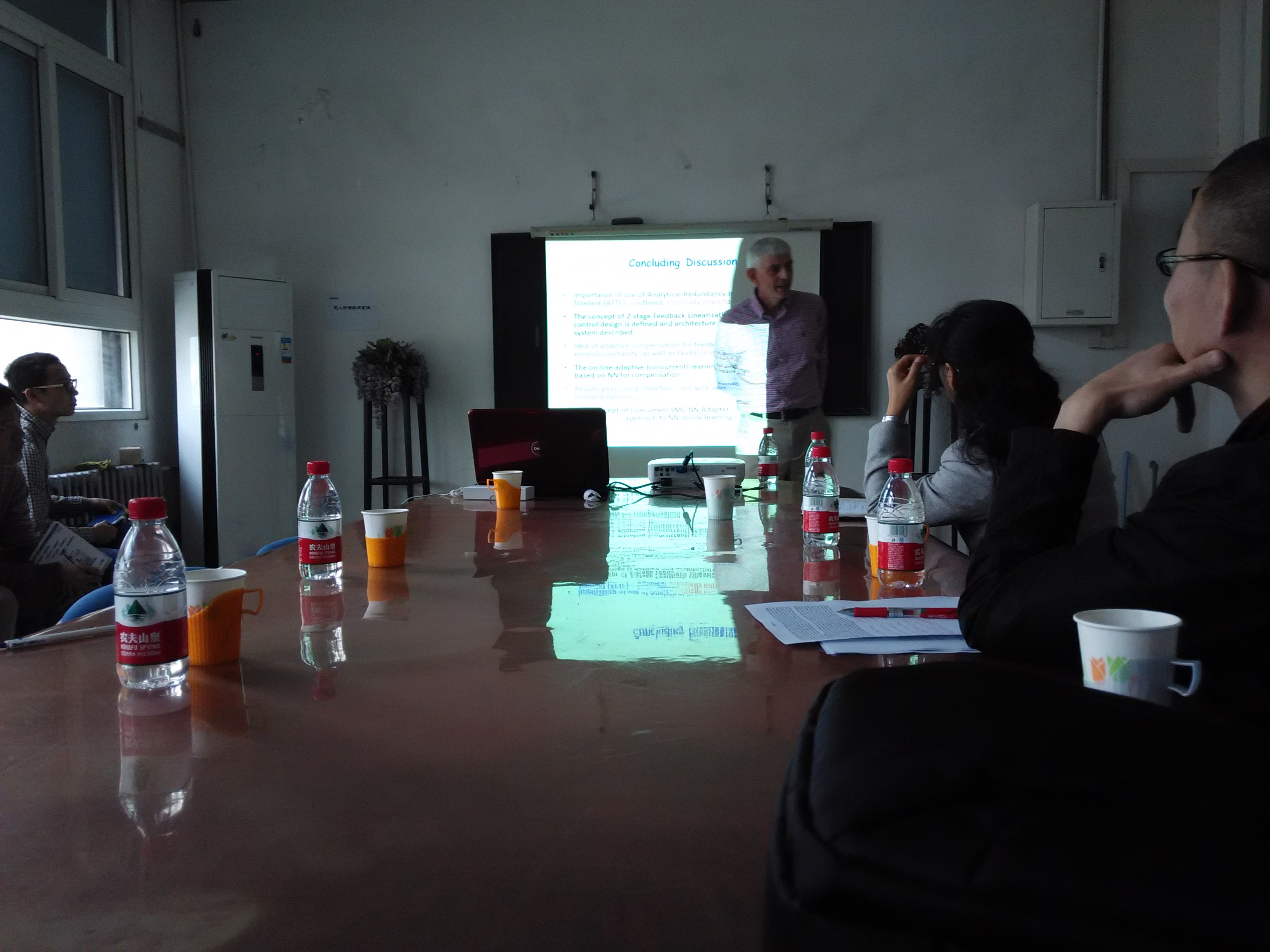 Ron J. Patton教授毕业于英国谢菲尔德大学,是故障诊断与容错控制领域的世界级权威专家,曾担任国际自动控制联盟(IFAC)技术过程安全性与监督委员会(Technical Committee on Safety & Supervision of Technical Process)主席,现任教于英国赫尔大学科学与工程公司,是IEEE Fellow,the Institute of Measurement and Control Fellow,AIAA senior member,曾主持多项欧盟科研项目,包括与英国罗罗公司和美国NASA合作开展的发动机控制与故障诊断研究。目前,Patton教授已发表348篇学术论文,其中包括114篇期刊论文,并已出版6部学术著作。在当天的报告会上,Patton教授以《Reconfigurable Flight Fault Tolerant Control for Nonlinear Unmanned Aerial Vehicle》为题,作了1个多小时的学术报告,内容涵盖了容错控制在无人机中的应用问题,报告内容深入浅出,在场的师生认真听取了报告会,并积极地与Patton教授进行了关于基于神经网络补偿的容错控制问题的交流。