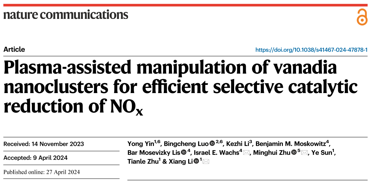 近日,304永利集团李想副教授团队与合作者在固定源烟气污染物控制领域取得重要进展。选择性催化还原是最广泛应用的烟气脱硝技术,然而传统钒基催化剂反应温度高难以适用于钢铁、水泥等工业窑炉的脱硝应用。如何通过活性位点精准调控强化钒基催化剂脱硝性能一直是该领域的挑战。团队基于H2低温等离子体表面处理,实现了低钒含量下高活性亚纳米钒氧团簇的快速合成,将脱硝效率提升十倍以上,并发现了吸附桥式硝酸盐参与氨活化的新反应路径,为固定源烟气脱硝提供了新思路。2024年4月27日,相关研究成果以“Plasma-assisted manipulation of vanadia nanoclusters for efficient selective catalytic reduction of NOx”为题在线发表于《自然·通讯》(Nature Communications)杂志。